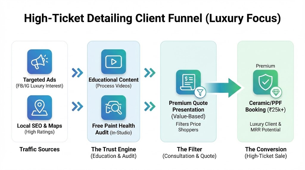 A customer walks in with a BMW or a Fortuner. They want their car to look brand new. You explain the benefits of Ceramic Coating or PPF (Paint Protection Film). You give them a quote for ₹30,000.