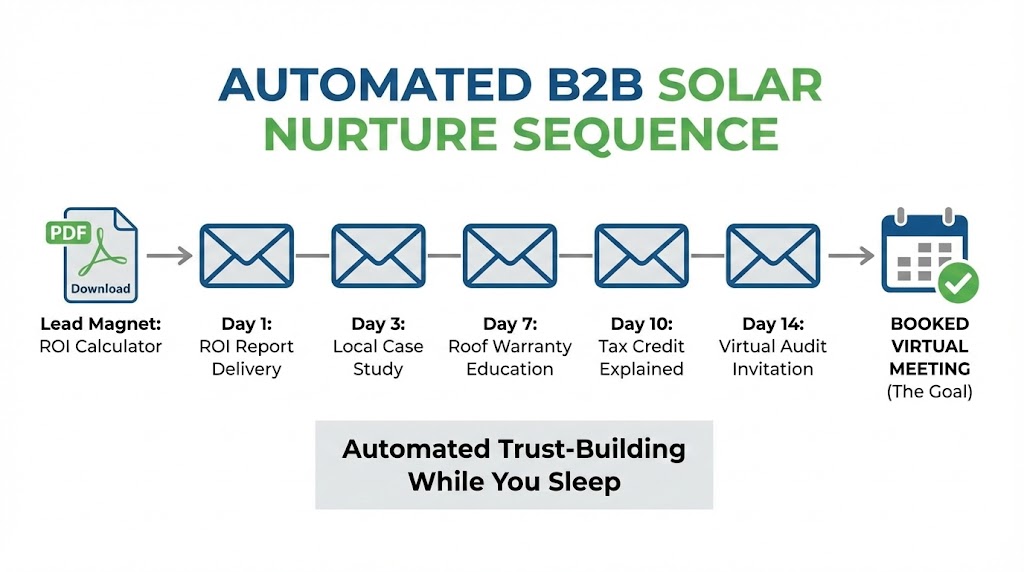Because a commercial deal can take months to close, your Solar Sales Strategy must include an automated follow-up system. You cannot rely on sales reps to manually email a CFO every week.